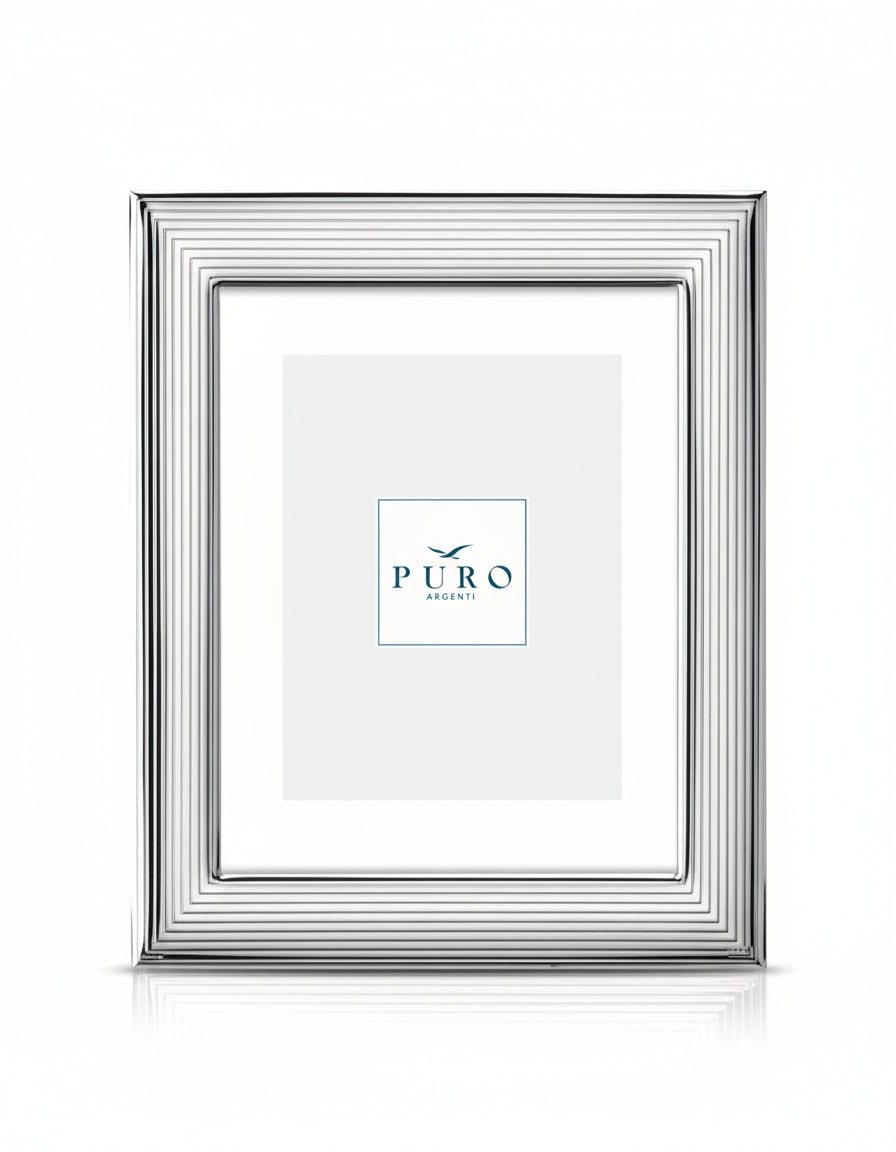 Portafoto linea Halley prodotto da Puro realizzato in argento con spalla posteriore in legno misure esterno cm 20 x 24interno foto cm 15 x 20