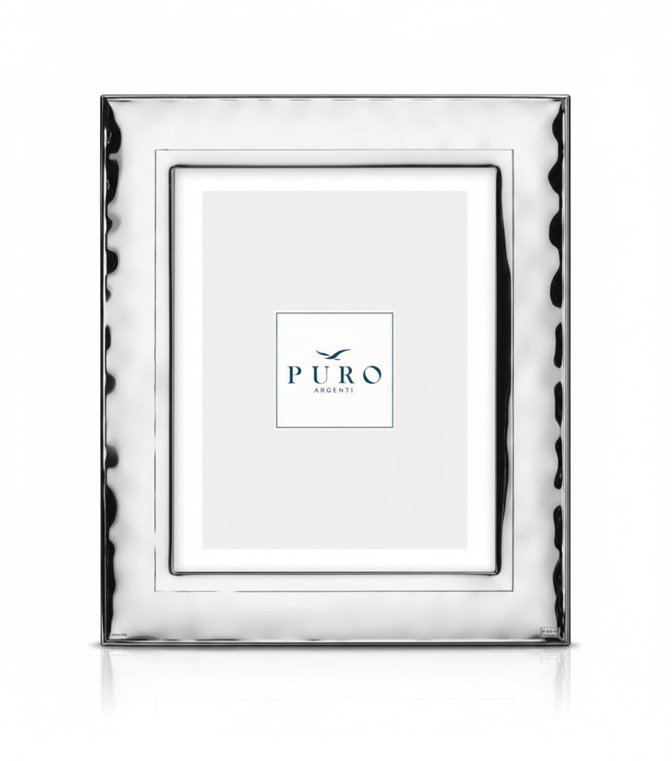 Portafoto linea Sigma prodotto da Puro realizzato in argento con spalla posteriore in legno misure esterno cm 32 x 27 interno foto cm 18 x 24